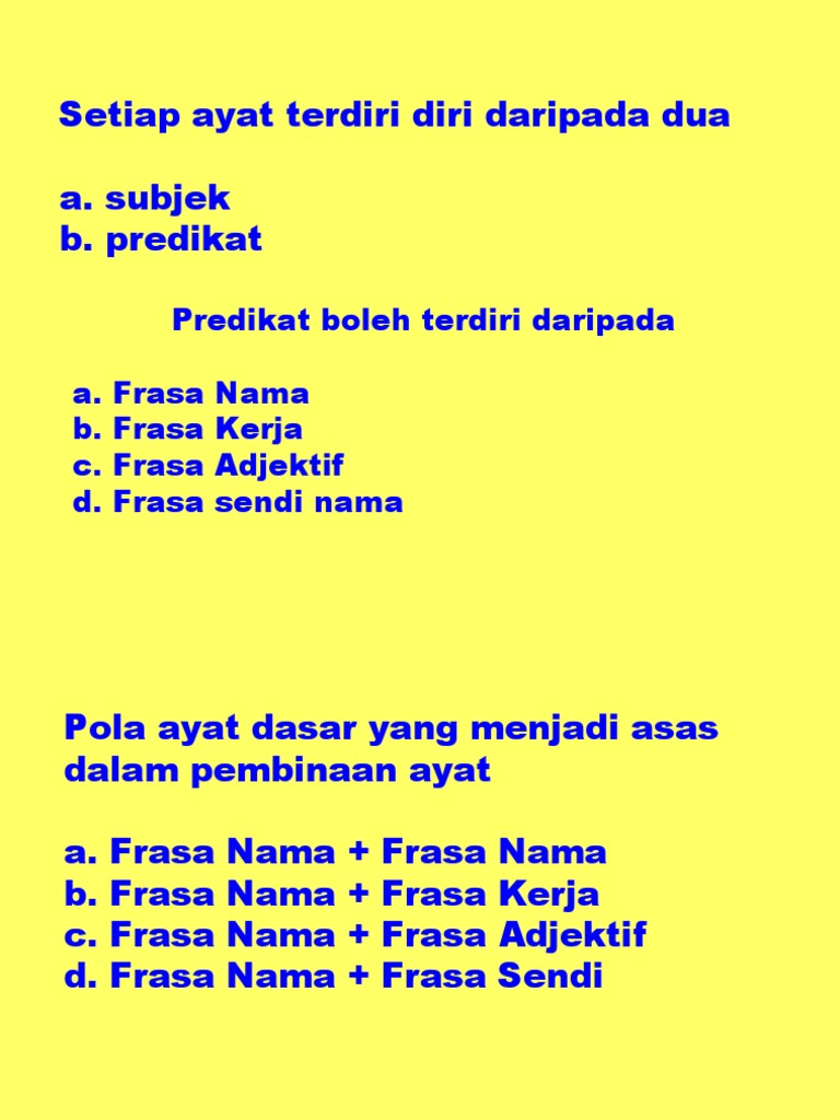Jika subjek dalam ayat 1 dan 2 dikembangkan ayatnya tetap mempunyai dua frasa. Frasa nama ialah kata intinya yang terdiri daripada A kata nama B kata ganti from BM SJKC 3043 at Institut Pendidikan Guru Kampus Batu Lintang.